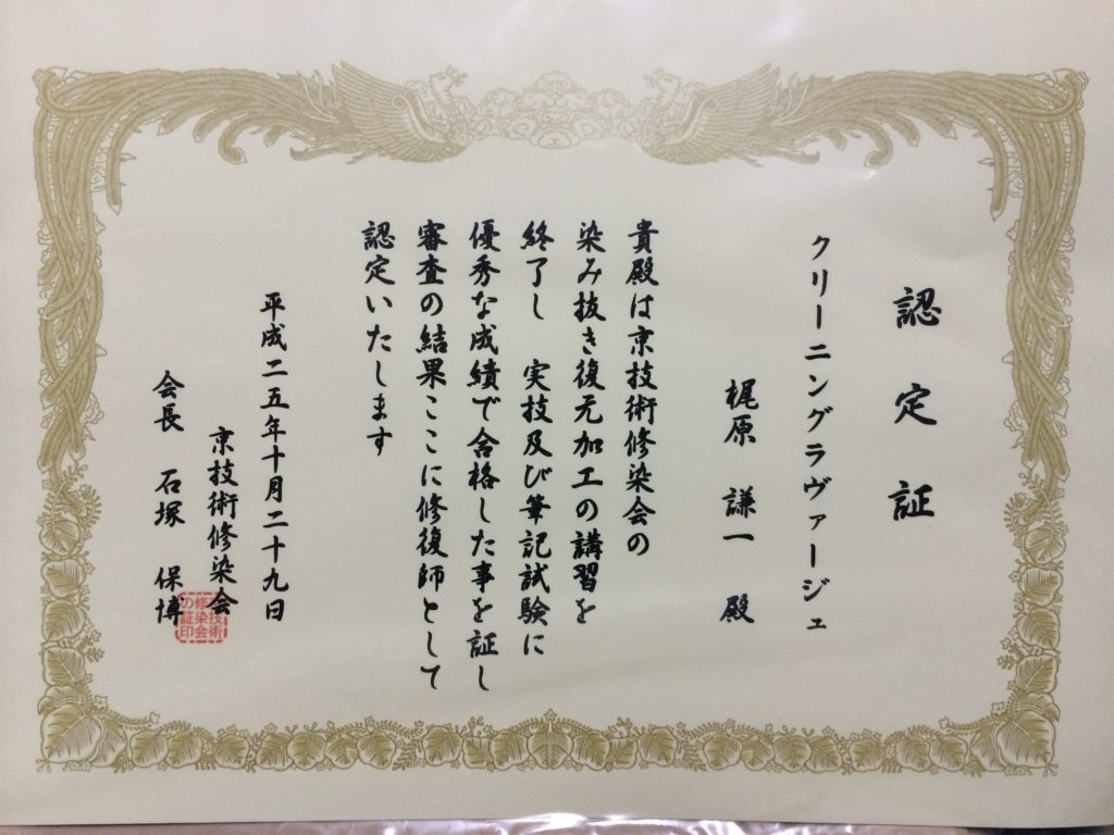 当店は、衣類のクリーニングと染み抜きにおいて20年のキャリアがあります。お客様の大切な衣類をお預かりする以上、妥協の無い仕上がりへのこだわりから、東京・大阪・京都・兵庫と技術の向上について学び続けています。仕上げもWHS整形仕上げ技能士の資格を取りブランドショップも納得がいく仕上げをしています。